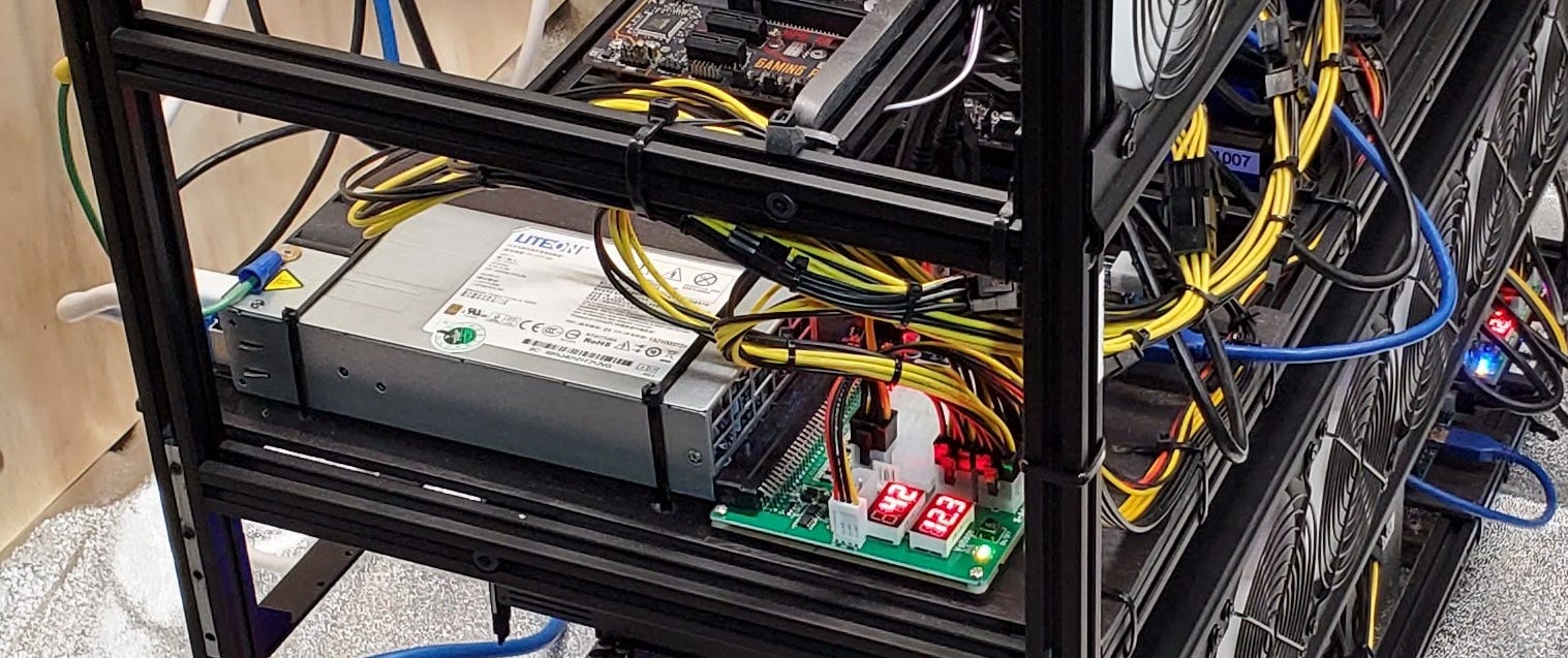 Currently it’s set up with just one stick of 8GB or RAM so I need to grab another stick from my spare parts tub to get to the recommended 16GB of memory. Power currently comes from a 1200W Dell Server PSU running a Parallel Miner “Breakout Board” adapting it for use on a retail motherboard. All this is attached to a tiny little “Mining Rig” frame and will live on a shelf next to my router, switch, and miscellaneous networking equipment on a wireframe rack behind me at my desk.